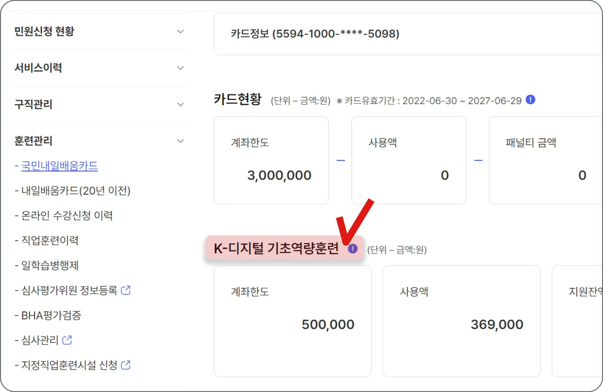 우리가 99클럽 알고리즘 강의 스터디에서 사용할 강의는 [K-디지털 기초역량훈련]에 해당하는 강의예요. 가장 상단에 있는 [카드현황] 및 [계좌한도]는 부트캠프 등 별개의 훈련에 사용되는 내역으로, 이번에 신청할 강의에는 사용되지 않으니 안심하세요!