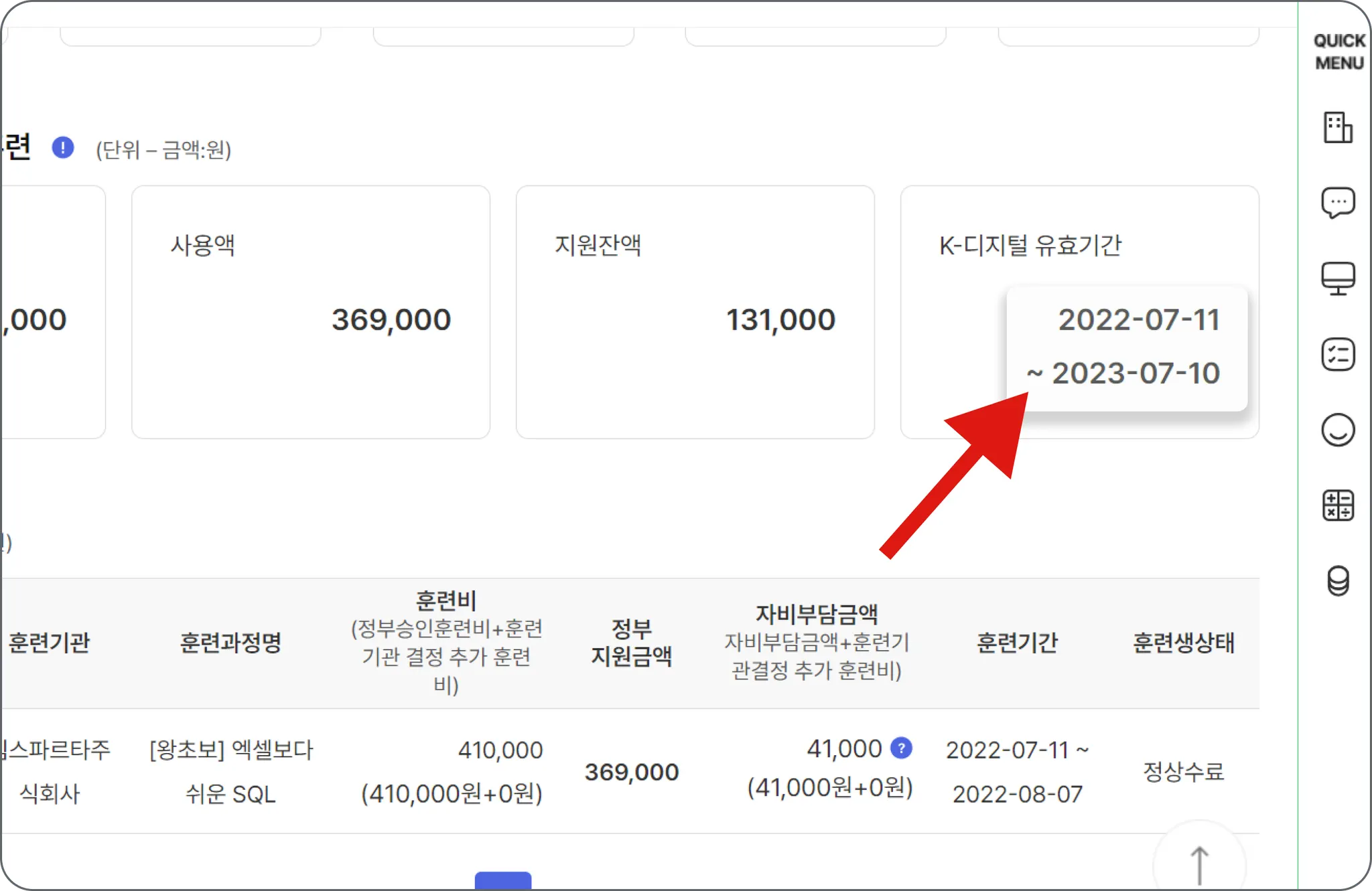 만약, 이미지와 같이 K-디지털 유효기간이 경과했다면 국비 지원으로 강의 신청이 어려워요.